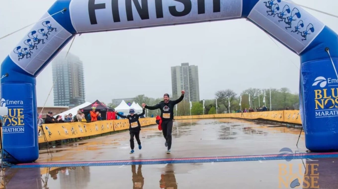 Linden Meza (trái) nắm tay bố Carlos khi về đích tại Blue Nose Marathon 2025. Ảnh: Blue Nose Marathon