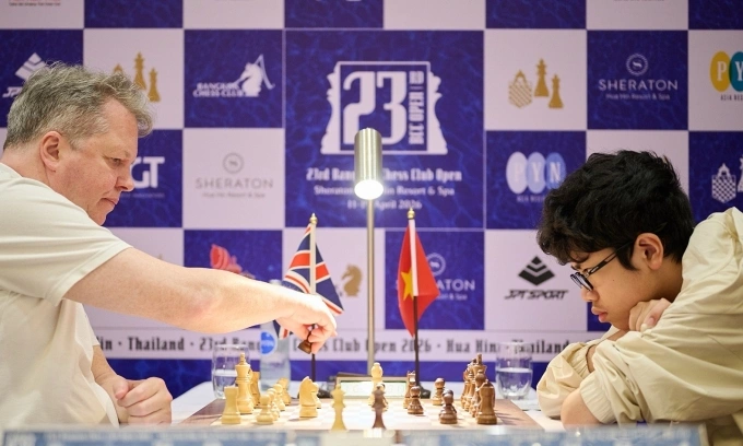 Khương Duy trong một ván đấu với Nigel Short ở Bangkok Mở rộng 2026. Ảnh: BCC